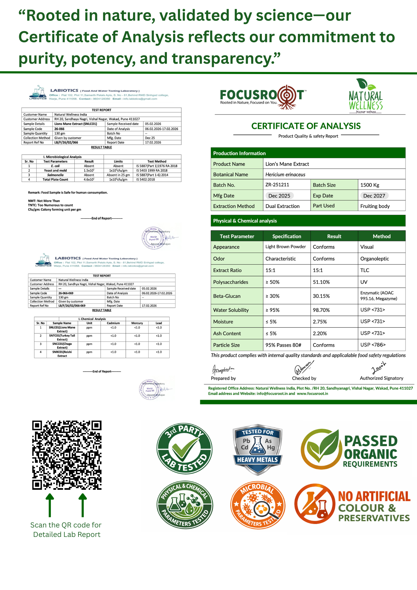 Every batch of Focusroot Lion’s Mane is produced in GMP-certified facilities, USDA certified, and independently tested by third-party laboratories to ensure quality, purity, and consistency you can trust.